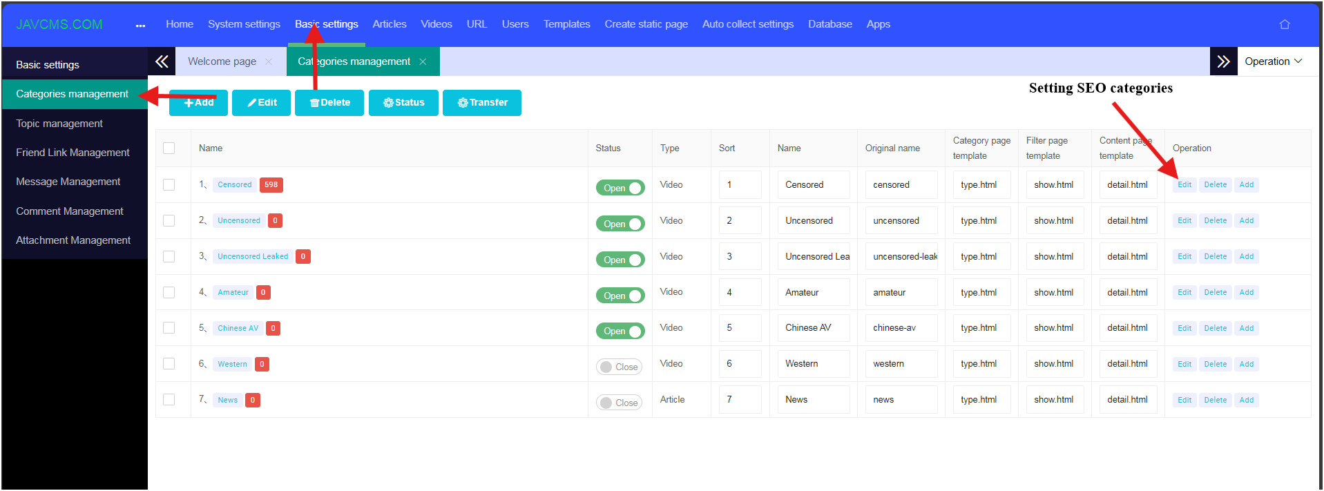 - Go to Basic Settings > Categories Management > Select Edit for the category you want to modify.