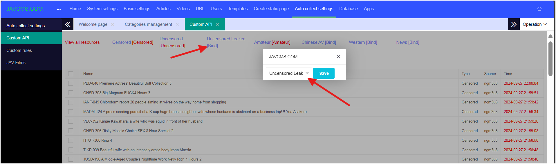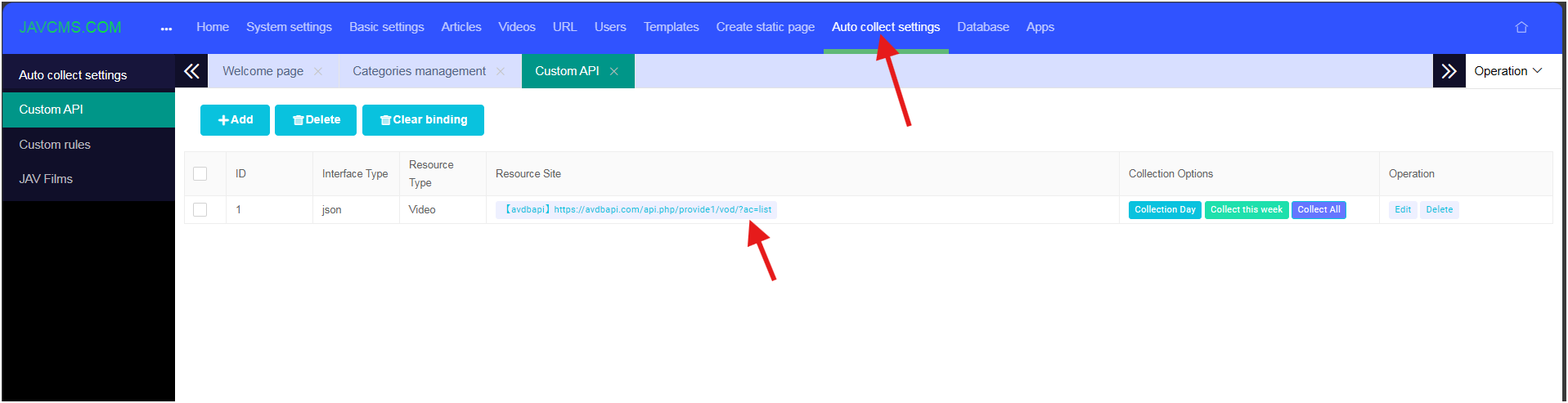 - Select Bind categories and choose the appropriate categories (*important). You must bind all categories, or the movies will be missing.